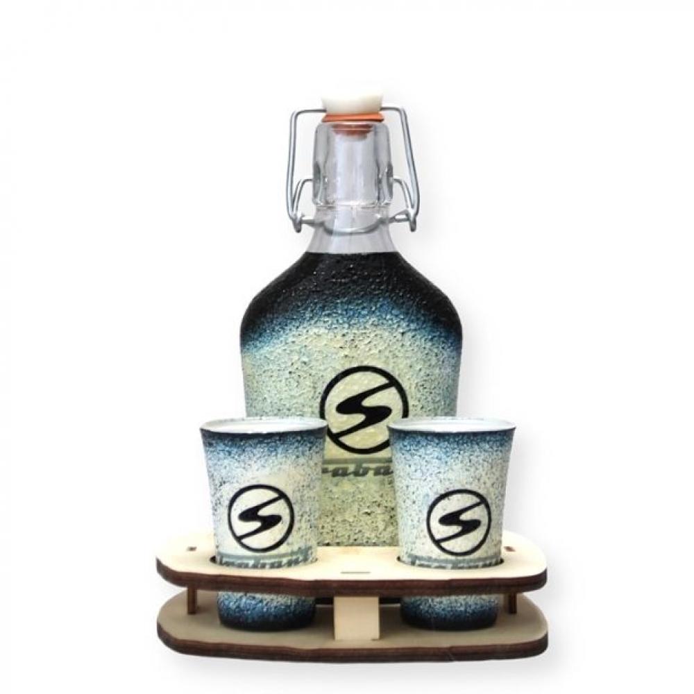 A szett tartalma: 0,2l üveg + 2 x 45 ml pohár + fatartó.
