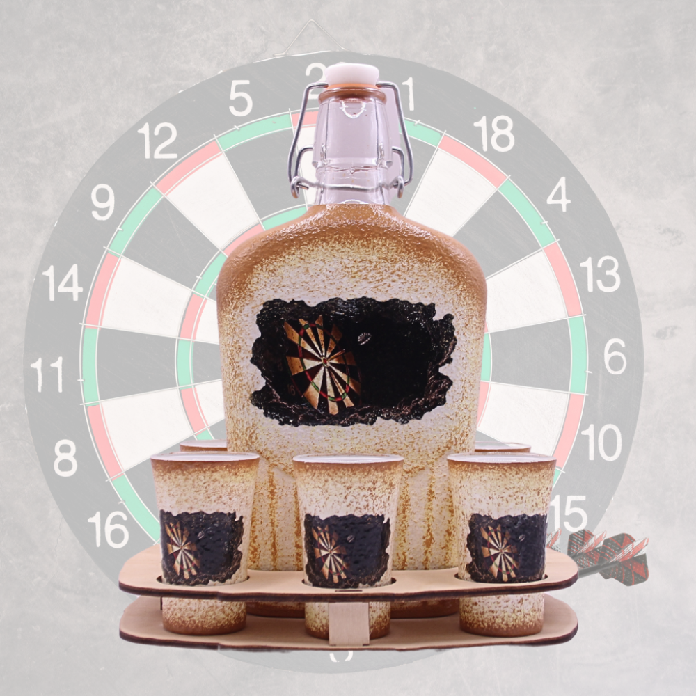 Egyedi kézműves pálinka kínáló szett darts motívummal