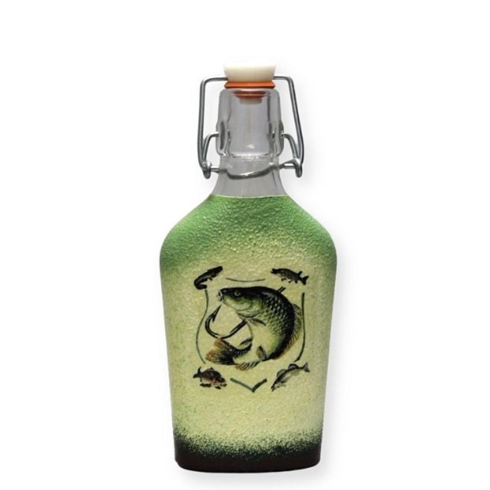 Horgász motívummal díszített csatos pálinkás üveg - egyedi kézműves ajándék horgászoknak