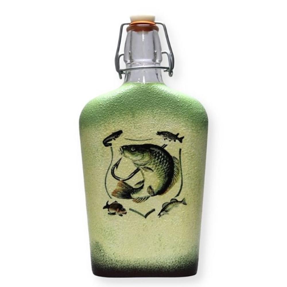 Horgász motívummal díszített nagy csatos pálinkás üveg - ajándék horgászoknak