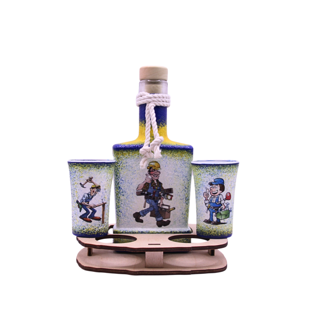 Humoros ábrákkal díszített pálinka kínáló szett barkácsolóknak