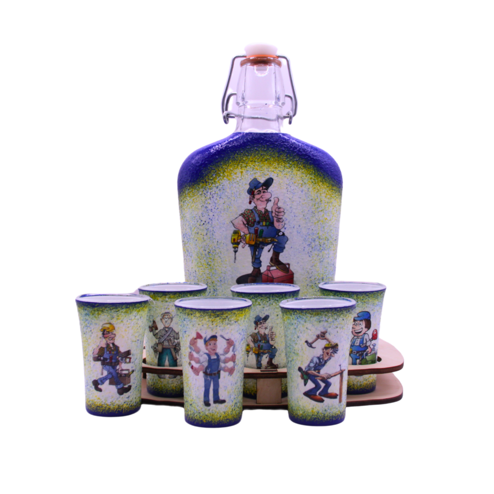 Humoros ábrákkal díszített pálinka kínáló szett barkácsolóknak - 6 klf pohárral