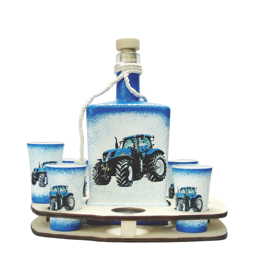 A szett tartalma: 0,5 l üveg ( alkoholt nem tartalmazz ) + 6 x 45 ml pohár + fatartó.