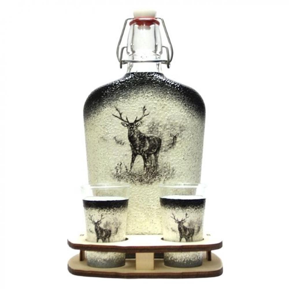 A szett tartalma: 0,5l üveg + 2 x 45 ml pohár + fatartó, kitakart pohárral ( a felső rész festetlen )