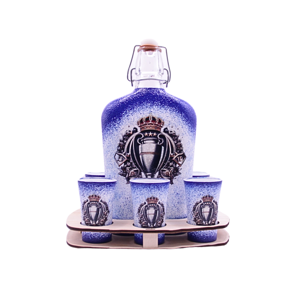 A szett tartalma: 0,5l üveg ( alkoholt nem tartalmazz ) + 6 x 5 cl pohár + tartó