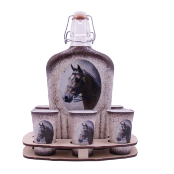 A szett tartalma: 0,5l üveg + 6 x 45 ml pohár + fatartó.