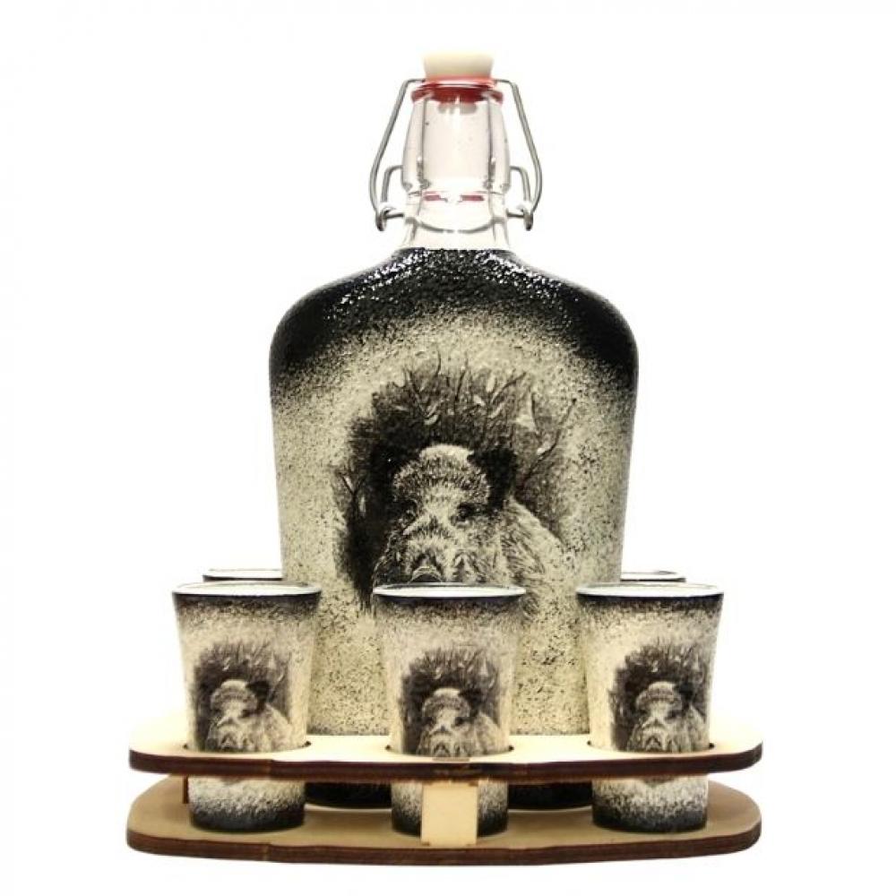 A szett tartalma: 0,5l üveg + 6 x 45 ml pohár + fatartó.